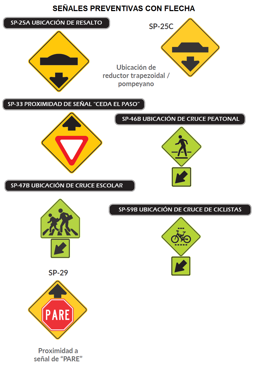El Manual de Señalización Vial indica lo siguiente. «Asimismo, se han fortalecido los parámetros de señalización orientados a la protección de usuarios vulnerables, como peatones, ciclistas y motociclistas, entre otros aspectos.» y que uno de sus objetivos específicos es «Comunicar a los actores viales la forma